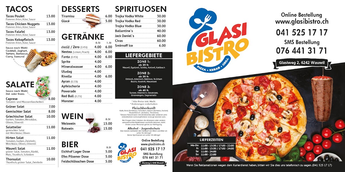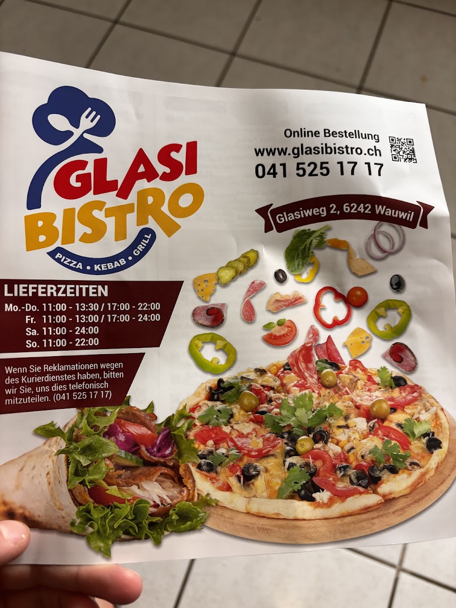 In conclusion, the menu at Glasi Bistro Kebab Pizza Grill offers a satisfying blend of classic comfort foods and flavorful specialties that cater to a wide range of tastes. The Taschenenbrot stands out as a hearty and well-balanced option, filled generously and perfect for a quick yet fulfilling meal, while the Pide delivers a more traditional touch with its crisp base and rich toppings that highlight the kitchen’s attention to flavor. Complementing these dishes, a refreshing Fanta adds a light and fizzy contrast, rounding out the overall dining experience. Altogether, the menu reflects a thoughtful mix of quality, variety, and accessibility, making it a reliable choice for both casual diners and those seeking something familiar yet satisfying.